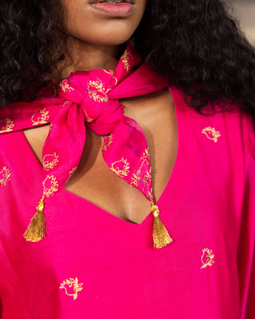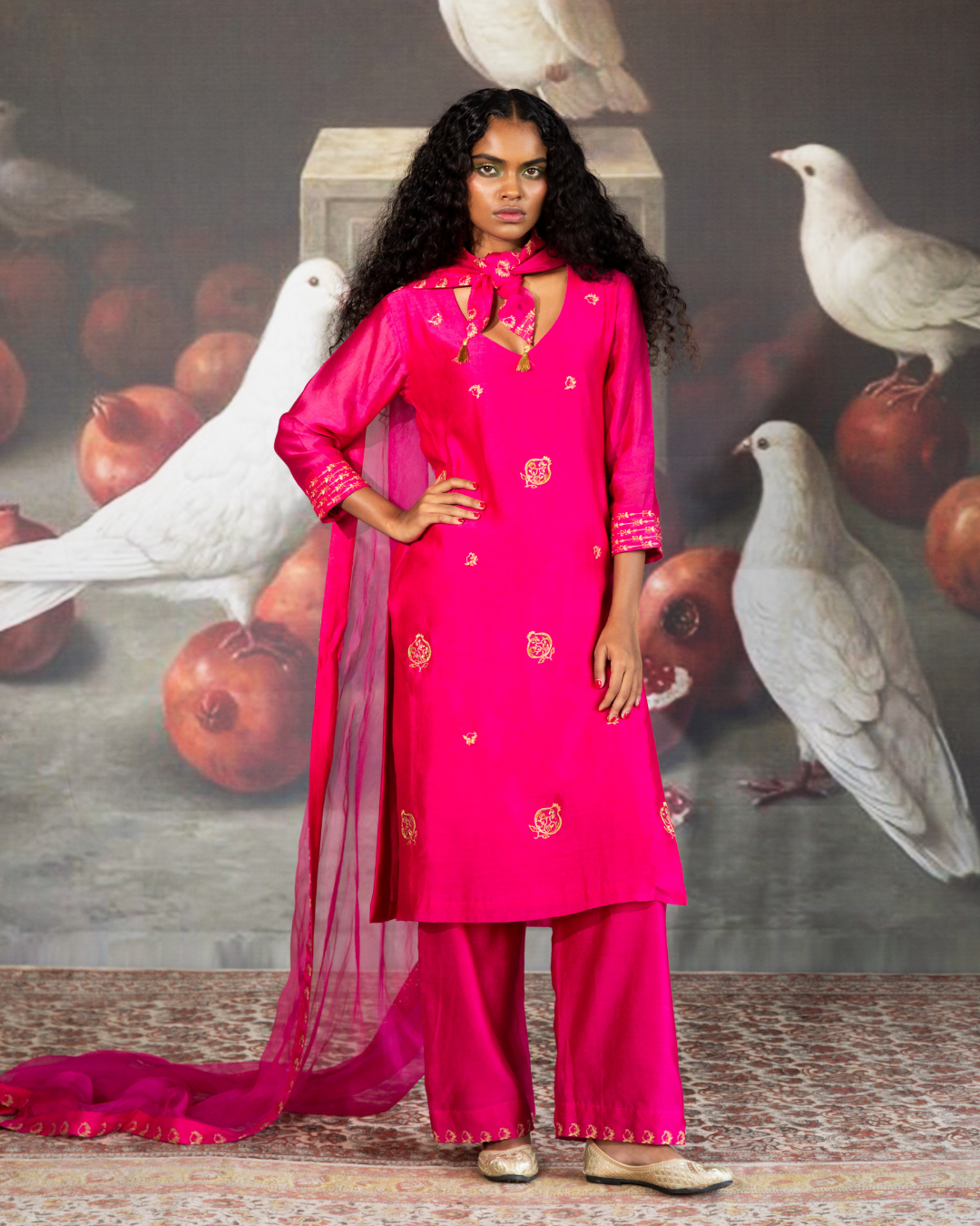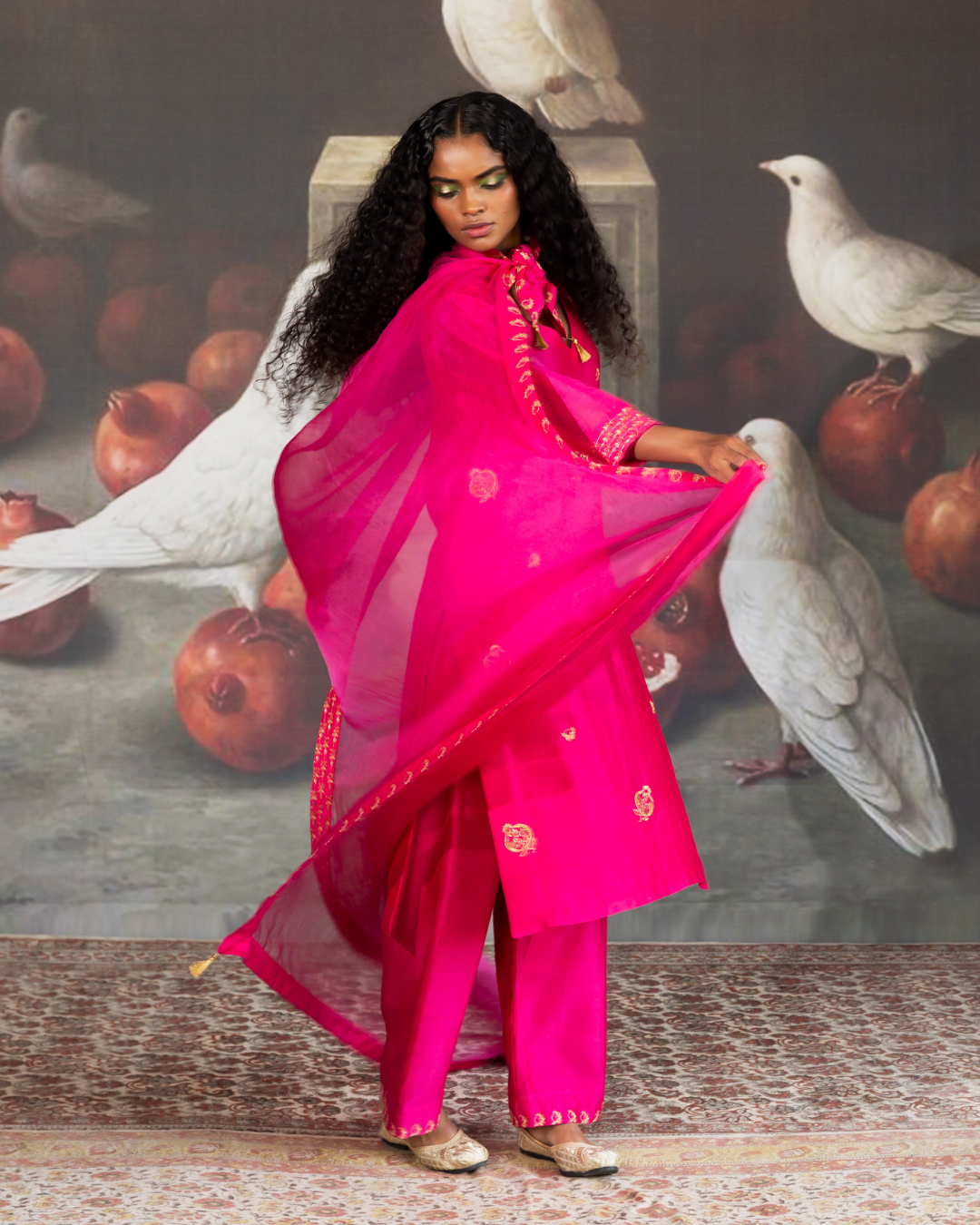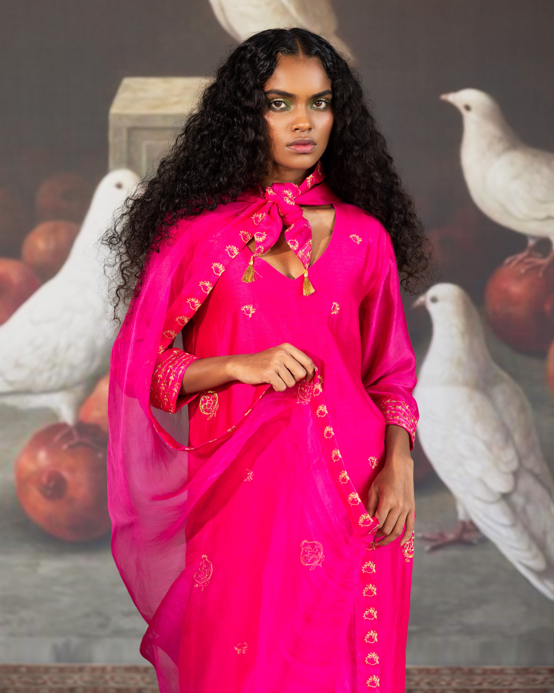 Celebrate effortless elegance with our Hand Embroidered Pink Chanderi Kurta Set, a stunning ensemble crafted for the modern woman who cherishes tradition with a contemporary edge.