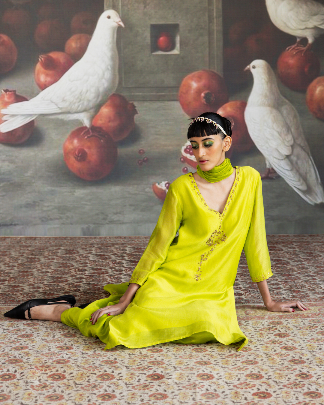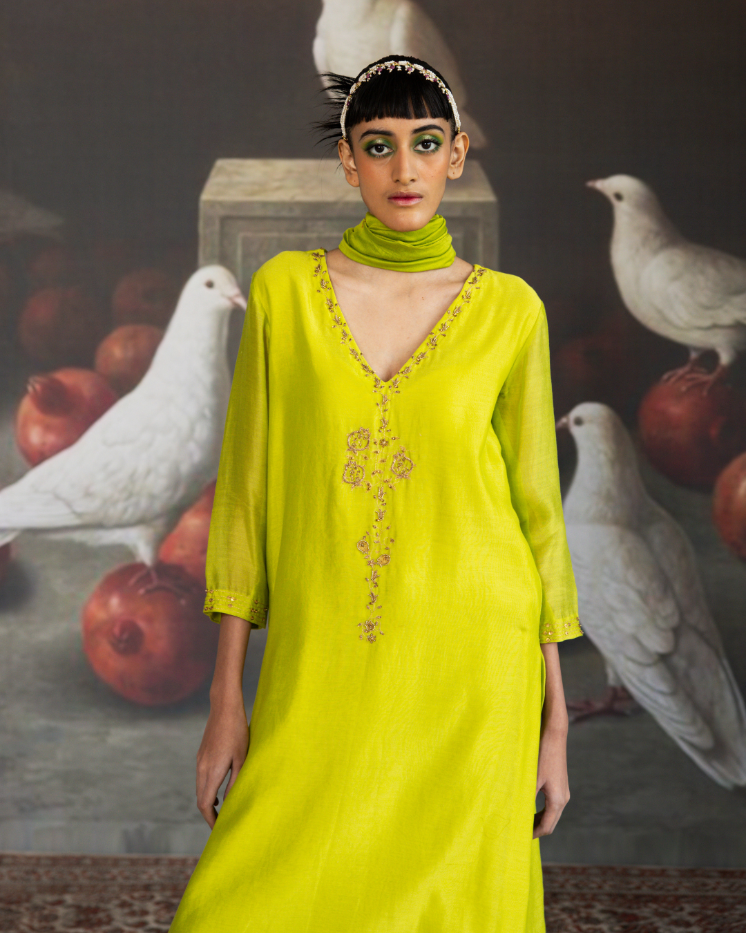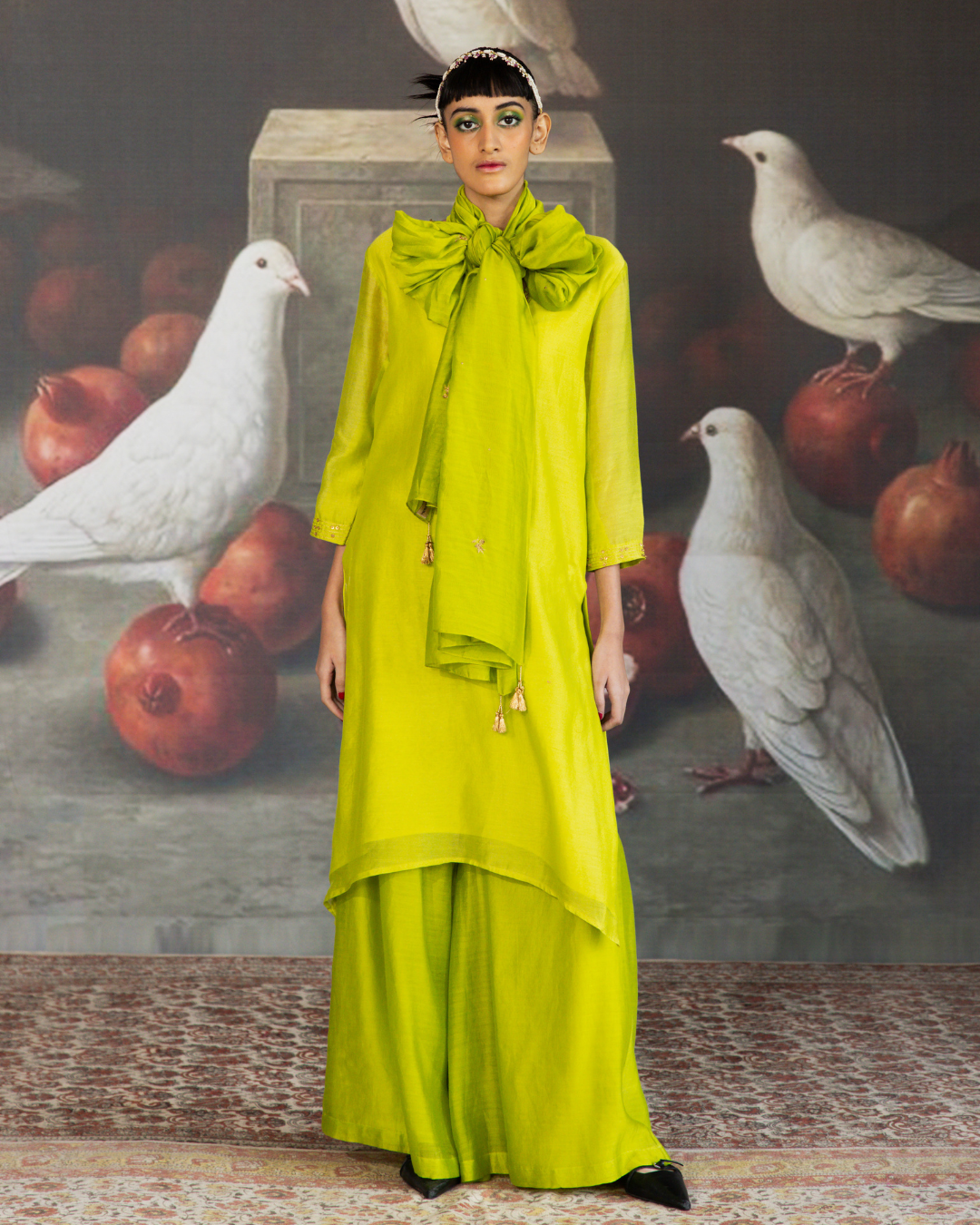 The set is beautifully paired with a hand-embroidered green pure Chanderi dupatta, adorned with intricate embroidery and detailed with playful tassels, enhancing the overall traditional appeal.